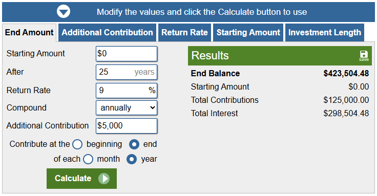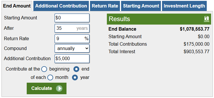 Let me share some real numbers that still make me cringe. If you invest $5,000 yearly starting at 30 earning 9%, you'll have about $1.1 million by 65. Wait until 40, and you'll only have about $425,000.